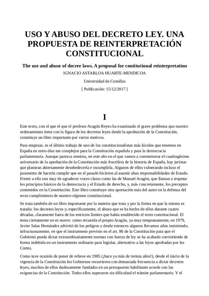 Este texto, con el que el que el profesor Aragón Reyes ha examinado el grave problema que nuestro ordenamiento tiene con la figura de los decretos leyes desde la aprobación de la Constitución, constituye un libro importante por varios motivos. Para empezar, es el último trabajo de uno de los constitucionalistas más lúcidos que tenemos en España en estos días tan complejos para la Constitución española y para la democracia parlamentaria. Aunque parezca mentira, en este año en el que vamos a conmemorar el cuadragésimo aniversario de la aprobación de la Constitución más fructífera de la historia de España, hay juristas que plantean abiertamente desobedecerla e incumplirla. Algunos de ellos vulnerando incluso el juramento de hacerla cumplir que en el pasado hicieron al asumir altas responsabilidades de Estado. Frente a ello son muy de agradecer voces claras como las de Manuel Aragón, que llaman a respetar los principios básicos de la democracia y el Estado de derecho, y, más concretamente, los preceptos contenidos en la Constitución. Este libro constituye otra aportación más del autor en la defensa del recto cumplimiento de nuestro régimen constitucional.
