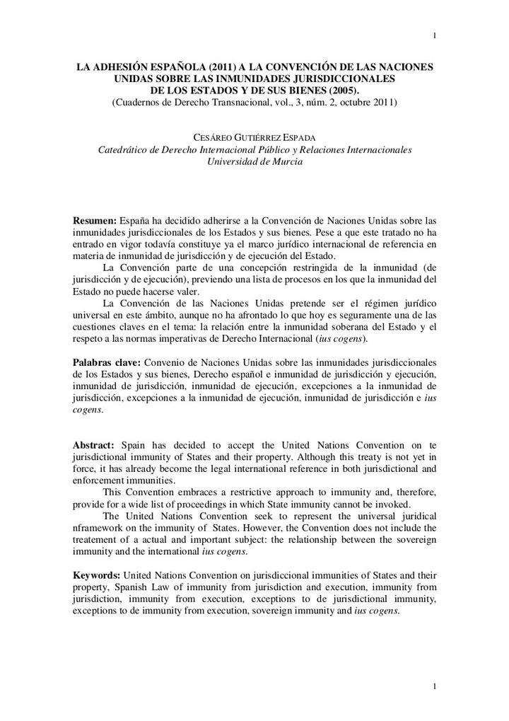 España ha decidido adherirse a la Convención de Naciones Unidas sobre las inmunidades jurisdiccionales de los Estados y sus bienes. Pese a que este tratado no ha entrado en vigor todavía constituye ya el marco jurídico internacional de referencia en materia de inmunidad de jurisdicción y de ejecución del Estado. La Convención parte de una concepción restringida de la inmunidad (de jurisdicción y de ejecución), previendo una lista de procesos en los que la inmunidad del Estado no puede hacerse valer. La Convención de las Naciones Unidas pretende ser el régimen jurídico universal en este ámbito, aunque no ha afrontado lo que hoy es seguramente una de las cuestiones claves en el tema: la relación entre la inmunidad soberana del Estado y el respeto a las normas imperativas de Derecho Internacional (ius cogens).
