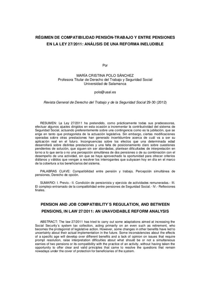 La Ley 27/2011 ha pretendido, como prácticamente todas sus predecesoras, efectuar algunos ajustes dirigidos en esta ocasión a incrementar la contributividad del sistema de Seguridad Social, actuando preferentemente sobre una contingencia como es la jubilación, que se erige en tanto que protagonista de la actuación legislativa. Sin embargo, ciertas modificaciones operadas sobre otras prestaciones han generado incertidumbre acerca de cuál va a ser su aplicación real en el futuro. Incongruencias sobre los efectos que una determinada edad desarrollará sobre distintas prestaciones y una falta de posicionamiento claro sobre cuestiones pendientes de solución, que siguen sin ser abordadas, plantean dificultades de interpretación en torno a lo que sería o no una percepción simultánea de dos pensiones o de su combinación con el desempeño de una actividad, sin que se haya aprovechado la oportunidad para ofrecer criterios diáfanos y válidos que vengan a resolver los interrogantes que subyacen hoy en día en el marco de la cobertura a los beneficiarios del sistema.