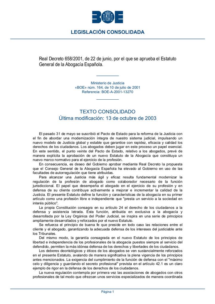 Para alcanzar una Justicia más ágil y eficaz resulta fundamental modernizar la regulación de la profesión de abogado como colaborador necesario de la función jurisdiccional. El papel que desempeña el abogado en el ejercicio de su profesión y en defensa de su cliente contribuye activamente a mejorar e incrementar la calidad de la Justicia. El presente Estatuto define la función y características de la abogacía en su primer artículo como una profesión libre e independiente que presta un servicio a la sociedad en interés público.