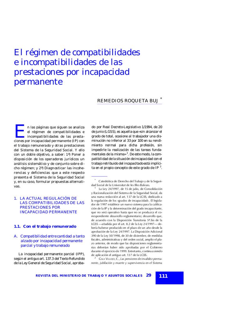 En las páginas que siguen se analiza el régimen de compatibilidades e incompatibilidades de las prestaciones por incapacidad permanente (IP) con el trabajo remunerado y otras prestaciones del Sistema de la Seguridad Social. Y ello con un doble objetivo, a saber: 1. Poner a disposición de los operadores jurídicos un análisis sistemático y de conjunto sobre dicho régimen; y 2. Diagnosticar las incoherencias y deficiencias que a este respecto presenta el Sistema de la Seguridad Social y, en su caso, formular propuestas alternativas.