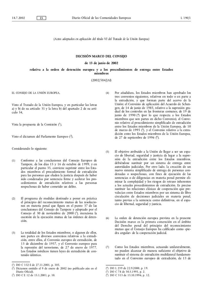 Decisión Marco del Consejo de 13 de junio de 2002, relativa a la orden de detención europea y a los procedimientos de entrega entre Estados miembros (2002/584/JAI)
