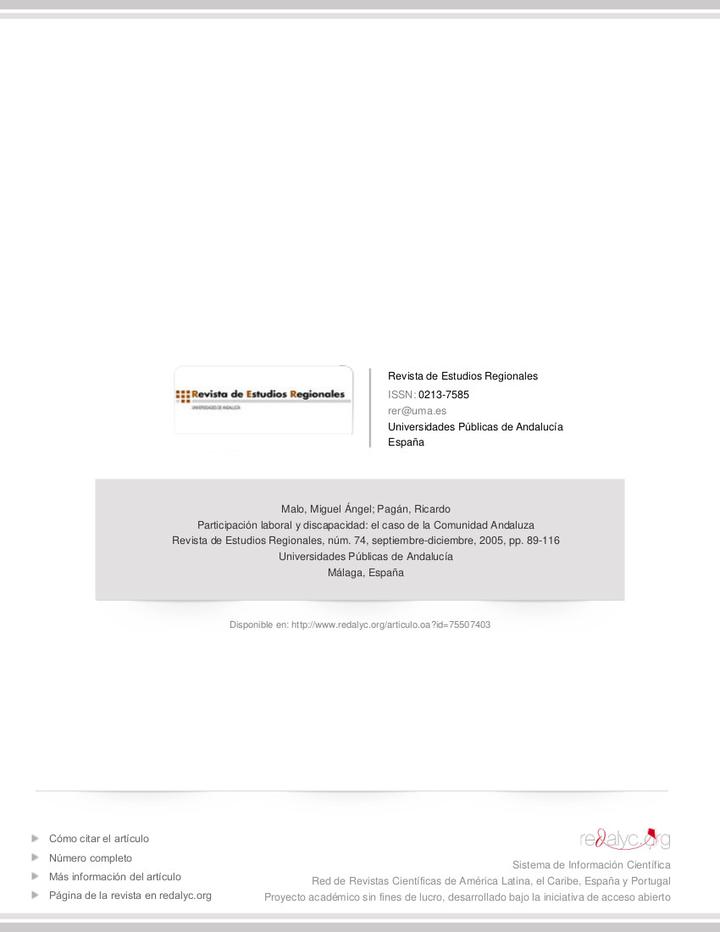 El resto del artículo se estructura de la forma siguiente. En el apartado segundo se hace una revisión de la literatura internacional y nacional sobre la relación entre discapacidad y participación laboral. En el apartado tercero se realiza el análisis empírico, comenzando con una descripción de la información contenida en la base de datos utilizada, el análisis descriptivo de las principales variables de interés y el análisis econométrico donde se presentan los resultados obtenidos al estimar diferentes especificaciones de un modelo de participación laboral. En el último apartado se recogen las principales conclusiones y una serie de recomendaciones de política económica. Además, se incluye un apéndice con los estadísticos descriptivos de todas las variables utilizada en el trabajo y las tasas de prevalencia por provincias dentro de Andalucía.