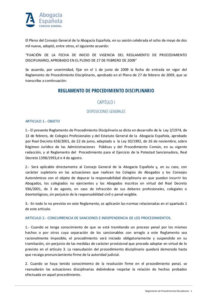 El presente Reglamento de Procedimiento Disciplinario se dicta en desarrollo de la Ley 2/1974, de 13 de febrero, de Colegios Profesionales y del Estatuto General de la Abogacía Española, aprobado por Real Decreto 658/2001, de 22 de junio, adaptado a la Ley 30/1992, de 26 de noviembre, sobre Régimen Jurídico de las Administraciones Públicas y del Procedimiento Común, en su vigente redacción, y al Reglamento del Procedimiento para el Ejercicio de la Potestad Sancionadora, Real Decreto 1398/1993,d e 4 de agosto. Será aplicable directamente al Consejo General de la Abogacía Española y, en su caso, con carácter supletorio en las actuaciones que realicen los Colegios de Abogados y los Consejos Autonómicos con el objeto de depurar la responsabilidad disciplinaria en que puedan incurrir los Abogados, los colegiados no ejercientes y los Abogados inscritos en virtud del Real Decreto 936/2001, de 3 de agosto, en caso de infracción de sus deberes profesionales, colegiales o deontológicos, sin perjuicio de la responsabilidad civil o penal exigible.