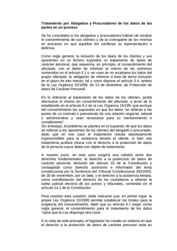 Sin embargo, el problema se plantea en el supuesto de que los datos se refieran a los oponentes de los clientes del abogado o procurador, dado que en ese caso el tratamiento resulta absolutamente imprescindible para la asistencia letrada al cliente, si bien ese tratamiento pudiera chocar con el derecho a la protección de datos de la persona cuyos datos son objeto de tratamiento.